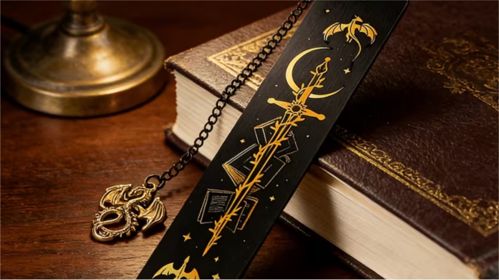 • Συλλεκτικό Δρακάκι: Διαθέτει μια κομψή μαύρη αλυσιδίτσα 10 εκ. που καταλήγει σε ένα λεπτομερές, επιχρυσωμένο διακοσμητικό δρακάκι, το οποίο αιωρείται έξω από το βιβλίο σας.