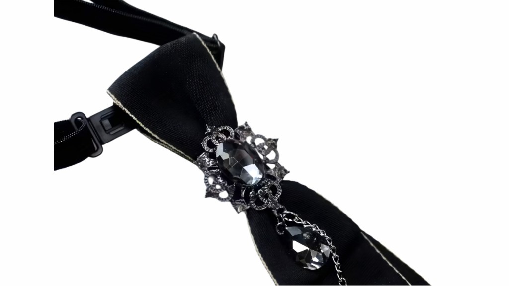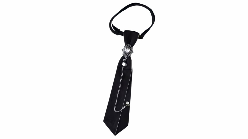 Αναδείξτε το στυλ σας με αυτό το μοναδικό γυναικεία γραβατόνι σε κλασικό μαύρο χρώμα, διακοσμημένο με κομψή αγκράφα, πετράδια και αλυσίδα στο μπροστινό μέρος (όπως οι σχετικές φωτός).
