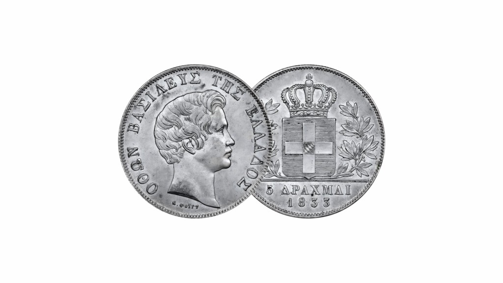 Πιστή αναπαραγωγή από το Πεντάδραχμο ή 5 Δραχμές του βασιλιά Όθωνα Α' του 1833 τα οποία κυκλοφόρησαν μέχρι το 1845 από το τότε βασίλειο της Ελλάδας.